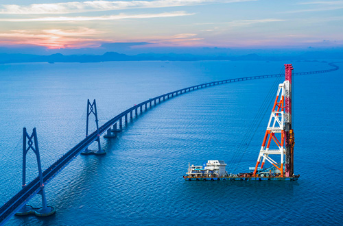 港珠澳大橋最大打樁機,科達液壓為其量身制定了大排量高轉速KD355+355串泵,液壓打樁錘12天12根樁端7.5米直徑單管鋼樁。并且多次配套國內首臺套,大型液壓打樁錘最大2500KJ、最新最大3500KJ